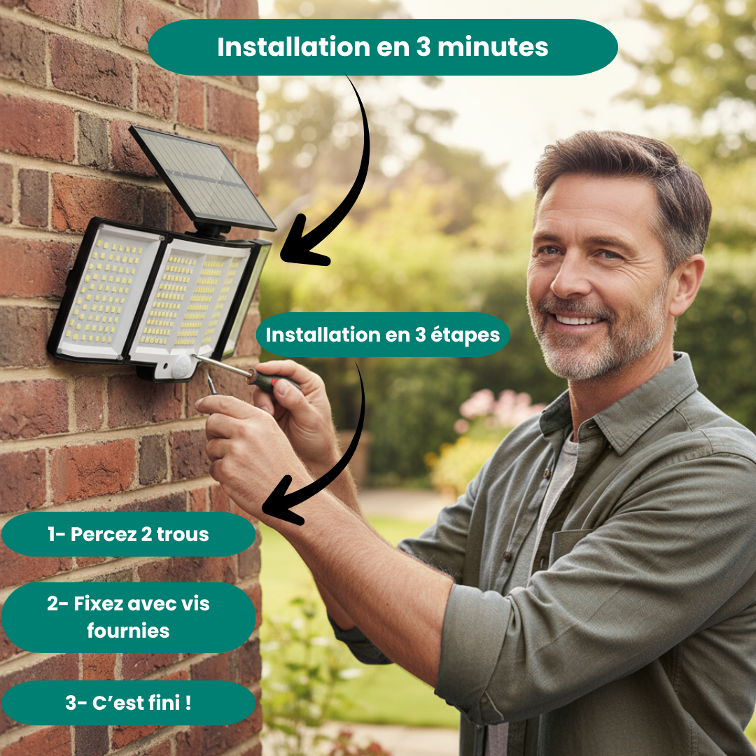 Batterie lithium 4400mAh + panneau solaire 3× plus grand que la concurrence = fonctionne 20 jours sans soleil. Résiste à tout : pluie, neige, -20°C à +50°C (certifié IP65).